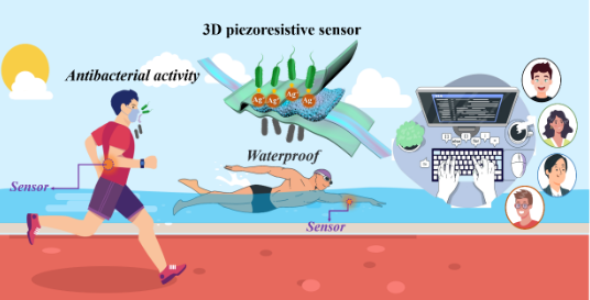近日,我校宿杰课题组在国际顶级期刊《Nano Energy》(中科院大类一区,影响因子:19.069)上发表题为“3D wearable piezoresistive sensor with waterproof and antibacterial activity for multimodal smart sensing”(https://doi.org/10.1016/j.nanoen.2023.108492) 研究论文。青岛大学曹明惠为论文第一作者兼通讯作者,青岛大学宿杰、刘彤与MGI集团工程师冷明为共同通讯作者。该项目得到国家自然科学基金以及山东省自然科学基金的支持。目前,高灵敏度、优异的稳定性和快速的响应已经逐渐满足了3D可穿戴压阻传感器的快速发展的要求。然而,对可穿戴电子产品至关重要的防水和抗菌性能等重要参数却没有得到足够的重视。本项工作利用石墨烯(rGO)、银纳米颗粒(Ag NPs)、三维聚氨酯(PU)和热塑性聚氨酯(TPU)制备了兼具防水和抗菌功能的三维可穿戴压阻传感器。该传感器最高灵敏度可达152.98 kPa−1,在连续工作超过10,000次后仍能保持优异的稳定性和灵敏度保持(~90%)。此外,该传感器展现了出色的防水和高抗菌活性(>99.9%),为实现日常穿戴提供了充分的便利。该传感器还可以捕捉到用户的指法习惯、打字强度和打字速度,克服传统密码认证系统在安全性上的缺陷,进一步提高了信息的安全性。该3D压阻式传感器在多模态智能传感领域显示出巨大的潜力,为开发智能可穿戴传感器和未来广泛的商业应用提供了机遇。