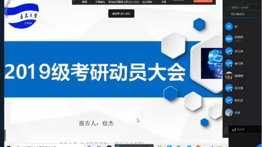 4月24日上午九点,pg游戏电子模拟器官网通过钉钉线上会议召开了“研路漫漫,与你同行”考研动员大会。院党委副书记李政、副院长宿杰出席会议,2018级考研优秀学生代表陈永昊、张艳婷和彭本旺在会上分享了考研经验,2019级、2020级近四百名学生参与其中。会议由2019级本科生辅导员赵晓辉主持。