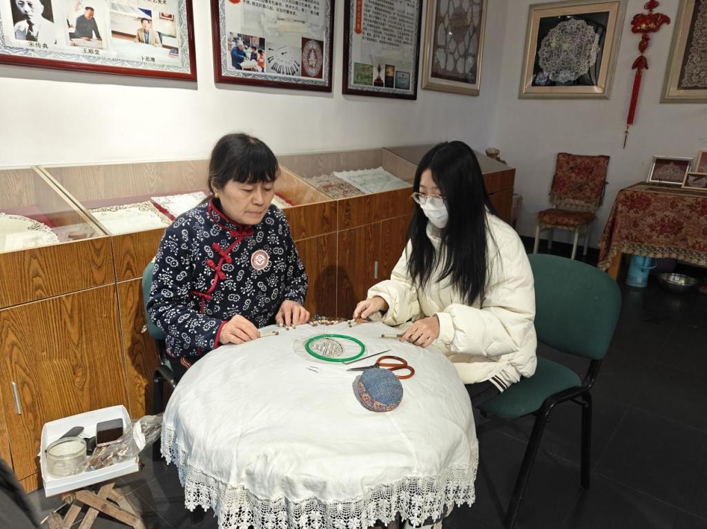队员们在参观完展厅后,在非遗传承人王秋老师的指导下,亲身体验感受花边大套这项传统非遗的魅力。王秋老师手中缠绕着棉线的棒槌宛如穿花蝴蝶般上下翻飞,以密龙、方结等针法巧妙穿梭,线丝交织缠绕,从最初的简单纹路逐渐勾勒出精美繁复的图案,这个过程往往需要耗时一个多月。
