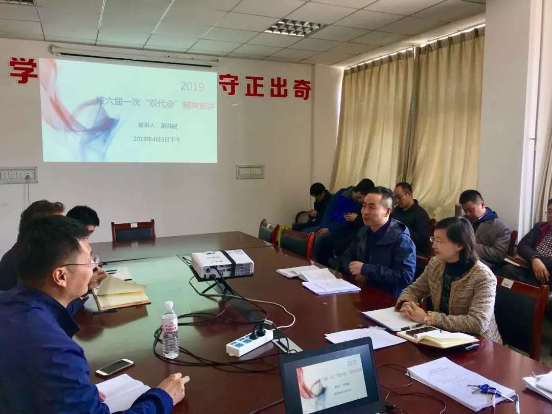 苗洪丽对校六届一次“双代会”精神进行宣讲。对校党委书记胡金焱六届一次“双代会”重要讲话做了重点传达,对校党委副书记、校长夏东伟《凝心聚力创先争先努力开创高水平大学建设新局面》工作报告进行详细解读。苗洪丽表示全体教师工要迅速行动起来,解放思想,求真务实,开拓进取,对照学校今后五年主要工作和2019年重点工作,结合学院实际,着手启动制定学院五年规划,把学院2019年工作任务逐条分解细化落实,责任到人,以实际行动落实“学院办大学”。