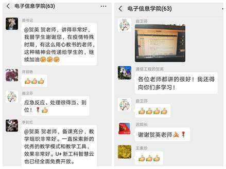 观摩学习结束后,全院一线教师在微信群进行了讨论交流,纷纷表示受益匪浅,党委书记苗洪丽和院长迟宗涛对贺英老师在线教学效果给予充分评价,要求全院教师认真学习借鉴贺英教师的教学设计方法和组织授课技巧,提高网课质量。苗洪丽强调,教学工作是人才培养的根基,疫情防控期间,全体老师要克服困难,精心准备,全力投入,确保质量,不断提高教育教学能力,确保线上线下教学实质等效。迟宗涛鼓励老师们在疫情特殊时期,深入研究、完善在线教学方法,建立起以学生为中心、以教师为主导的交互式教学模式。关爱学生,抓好课程各项教学环节的落实,圆满完成战“疫”时期的教学任务。