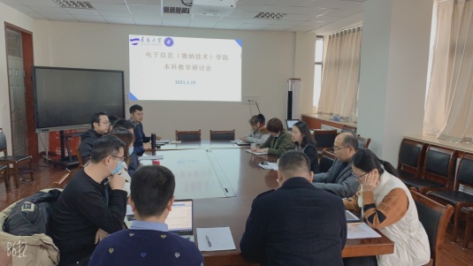 2021年1月15日下午,电子信息(微纳技术)学院在诚思楼407会议室召开2021年第一次本科教学工作研讨会。会议围绕“2021版人才培养方案修订,推进一流课程建设,提升人才培养质量”主题进行。副院长宿杰主持会议,学院党委书记苗洪丽,各系党政负责人、实验中心负责人、教科办负责人参加会议。