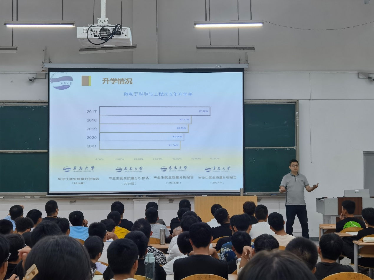 郑宇向学生们介绍了微电子科学与工程专业的基本知识、学术范围与学科素养。他指出,国家对微纳技术等高精尖行业的重视程度不断加深、投入经费不断增多,但我国面临行业人才短缺等问题,希望同学们认真完成本科阶段的学习,同时树立考研深造的目标,考入更高一级的学府,担负起为国家尖端科研事业做出贡献的重任。