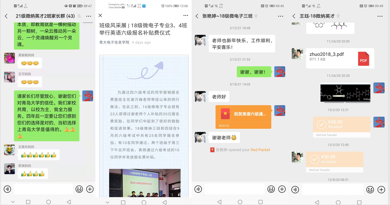 今年,谢万峰虽然在韩国进修学习,但依然十分关心和注重对学生的学习指导,他担任班主任的18级微纳班考研过线率达到76.7%,录取率为60%,创历年新高。