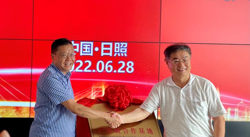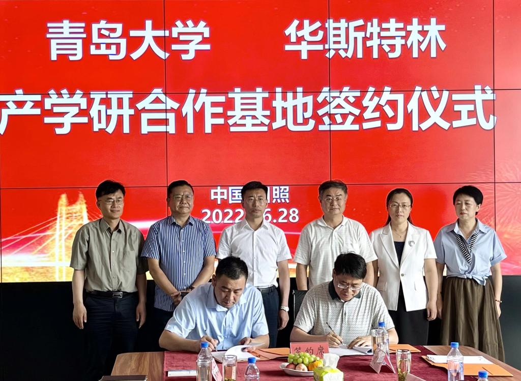 夏东伟和程一峰共同为青岛大学---日照华斯特林产学研合作基地揭牌,李山东与华斯特林科技有限公司总经理郭峰签署合作协议。