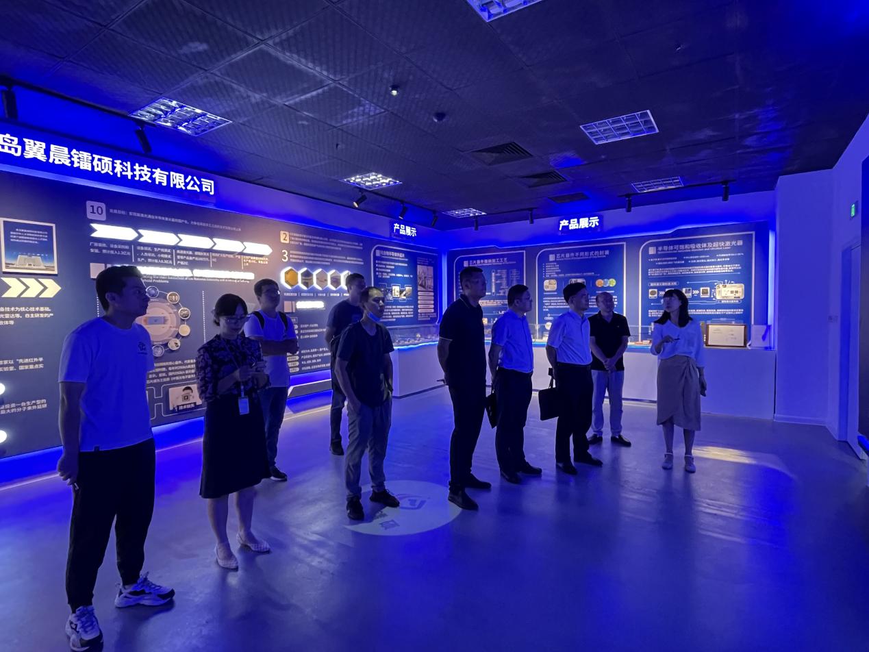 8月24日,pg游戏电子模拟器党委书记张启春,胶州校区建设办公室主任、上合示范区经贸学院副秘书长马林刚,学院副院长宿杰等一行5人到青岛翼晨镭硕科技有限公司调研交流。青岛大学红外半导体光电子研究院院长、青岛翼晨镭硕科技有限公司董事长张子旸、总经理王美芳、研发总监陈红梅、高级工程师贾宪生等参加相关活动。