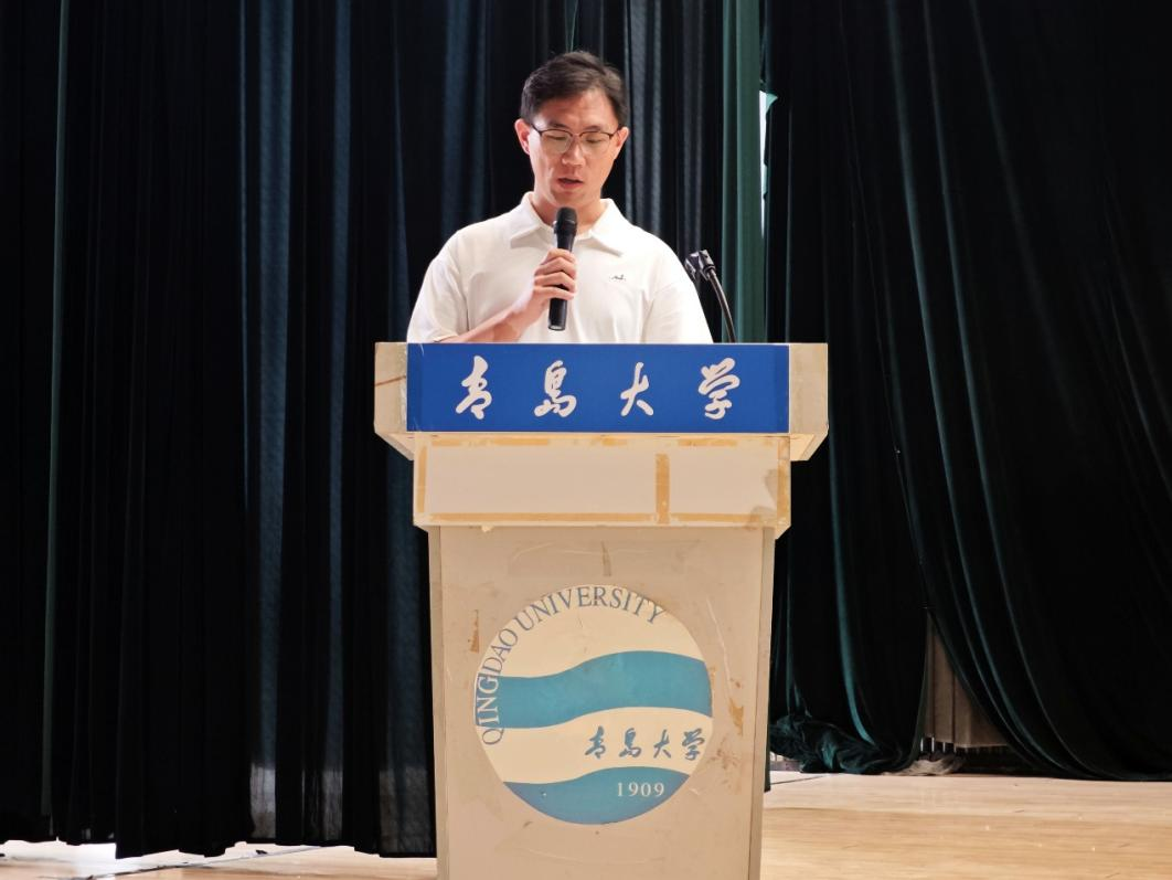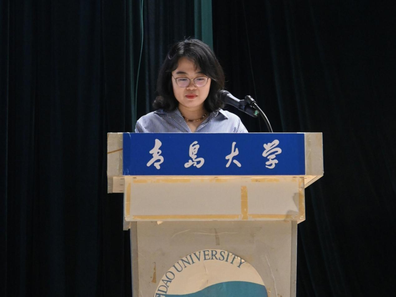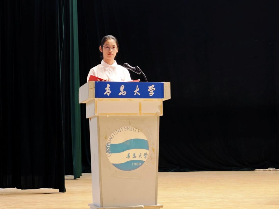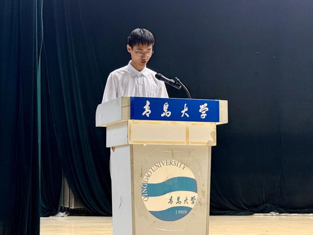 2025级新生代表汤婉婷回顾了高考拼搏历程与军训磨练,表达了对大学专业学习的憧憬与规划。并号召同学们夯实基础、强化实践、知行合一,在“明德、博学、守正、出奇”校训精神的指引下,在青岛大学书写无悔青春。